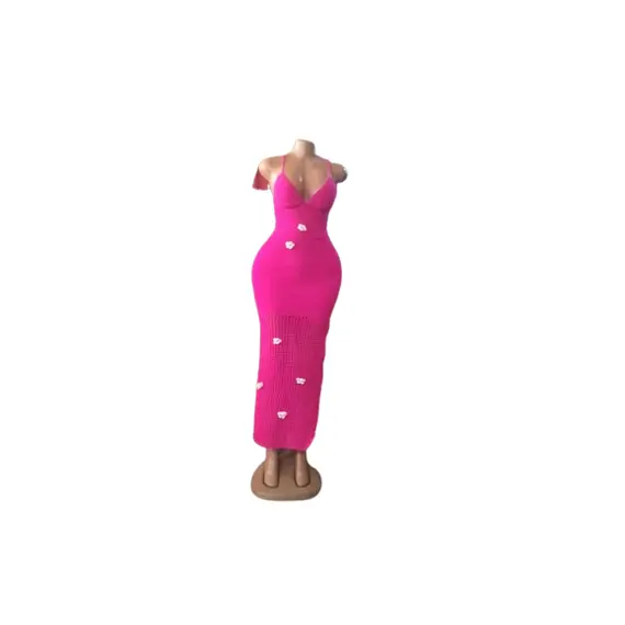 This is a stylish, handcrafted crochet dress in a vibrant pink color. It features a body-hugging silhouette with a deep V-neckline and thin shoulder straps, accentuating a feminine shape. The dress is ankle-length and adorned with small white flower or heart-shaped embellishments scattered throughout the lower section, adding a touch of charm and elegance. Perfect for summer events or special occasions, this dress combines craftsmanship and fashion