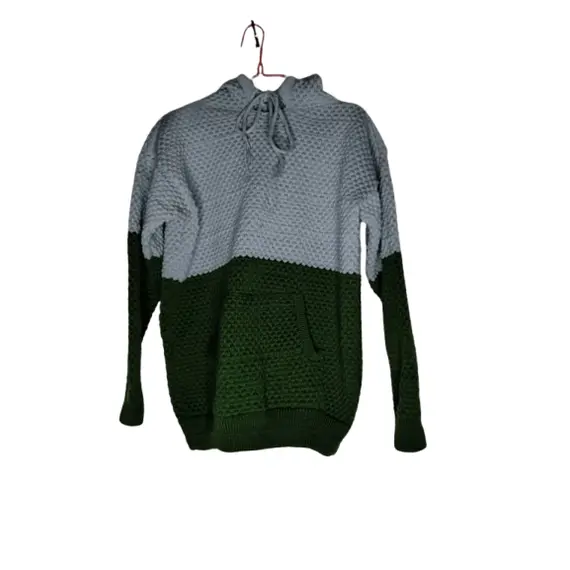 This handmade crochet sweater showcases alternating green and gray horizontal stripes for a soft yet stylish appearance. Designed with breathable stitchwork, it features a round neckline, long sleeves, and ribbed cuffs and hem for a cozy and secure fit. Whether for casual outings or chilly days, this sweater combines comfort, warmth, and a modern touch of color