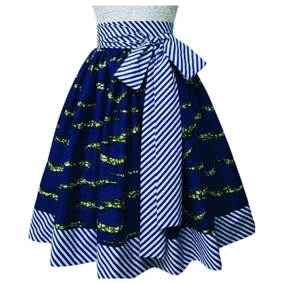 Add a touch of elegance to your wardrobe with this Chic African Print Midi Skirt. Designed with a bold blue African print complemented by classic striped details, it features a wide waistband and a statement bow that enhances your silhouette. Perfect for both casual and formal occasions, this skirt is a timeless piece that blends cultural flair with modern fashion.