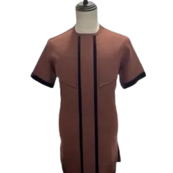 Fashionable short-sleeve men's shirt in a rich brown color with black accents. The shirt features a unique front design with two vertical black stripes running down from the chest to the hem, and angled chest seam details that add structure. Black trimming on the sleeve cuffs provides a sharp contrast, giving the shirt a modern and tailored appearance.Â