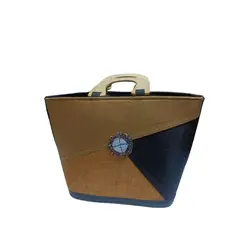 Combining modern style with cultural richness, this handmade Rwandan tote features a brown and black fabric design accented by a circular traditional beadwork emblem. Ideal for fashion-forward shoppers who love cultural elegance.