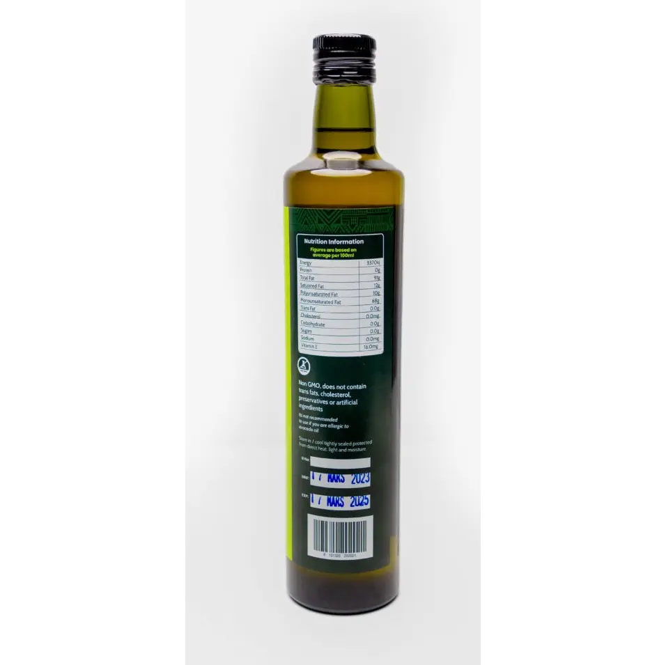 - 100% pure extra virgin avocado oil, cold-pressed from ripe avocados