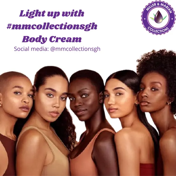 M&M Collections Ghana Body Cream. It is made with Shea butter and Essential Oils, from Africa specifically Ghana. Our Body Cream does not bleach or darken skin but serves as a healing cream by clearing acne or dark spots from skin naturally and brightens skin. it serves as an anti-aging cream, reducing the visibility of wrinkles and ensuring a smooth glowing skin. It also protects skin from sun- rays.