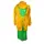 This stylish handmade knitwear set features a vibrant yellow cardigan with buttons and a waist tie, paired with a matching cap. Underneath is a beautifully crocheted green dress, offering both comfort and elegance.